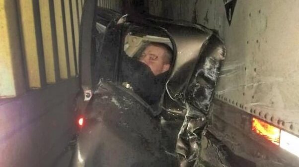 Photographs of the scene show something that looks like a murder scene. The truck behind him had driven so far into his vehicle that there was barely any car left to see.