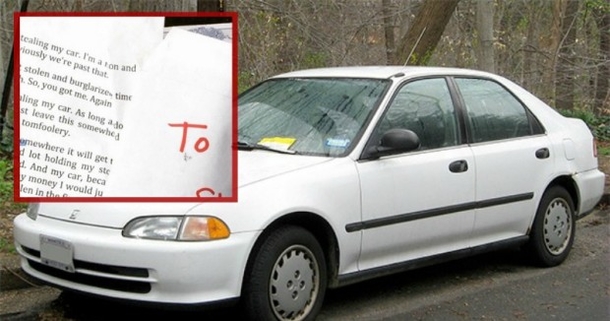 After every carjacking, the car was eventually found in the same condition in which it was taken, but she was fed up with dealing with the tow people who were holding it for ransom. Knowing the theft was a recurring issue, she took matters into her own hands, leaving an incredibly snarky note for the next thug who took it. To her complete surprise, it worked like a charm.